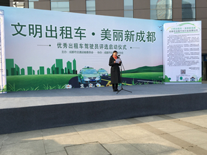 在当天的启动仪式上,蓉城公司党委书记董事长薛瑗代表成都市46家出租汽车企业作了发言表态:“落实企业主体责任,诚信规范经营;自觉遵守自律公约,完善管理体系;加强企业文化建 设,体现人文关怀。在新的历史条件下,始终牢记使命不忘初心,转变思路、创新求变、转型升级,融合发展,带领出租汽车驾驶员共同为建设美丽新成都、国家中心城市而努力奋斗。”驾驶员赵国成带领现场50名驾驶员代表在启动仪式上进行了宣誓:“以实际行动自觉维护行业文明窗口形象。自觉遵守行业和企业的各项规章制度,严格做到规范诚信服务。努力争创文明行车、依法行车的楷模。为打造文明出租车,美丽新成都,奋发努力!”